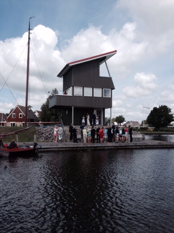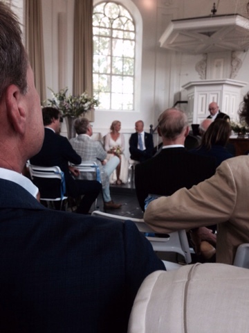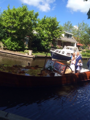 Weer moeten verleggen. Ditmaal naar de gehoopte middensteiger. Uiteindelijk toch nog last minute omgekleed en gedoucht. Ernst-Jan kwam aan met de auto. Om half drie begon het huwelijk. In de tuin bij de kerk. Het bruidspaar kwam , met een bootje aan.