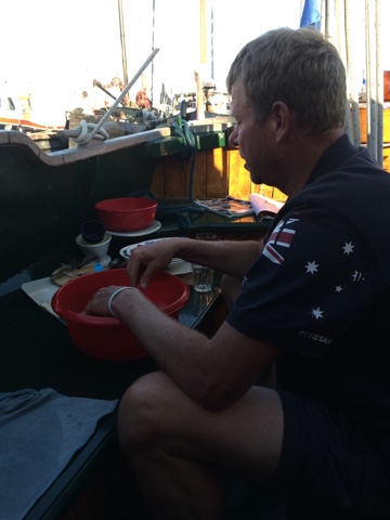 S avonds in de kuip geborreld en gegeten. Bastiaan geeft Bouwe een roeiles en borrelt op de Roos.