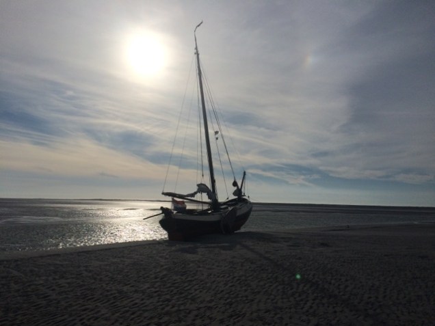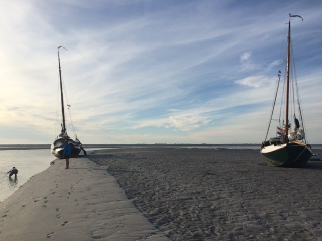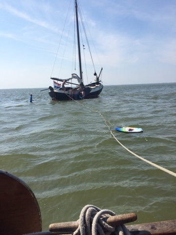 Bij Oosterom 70 gaan we voor anker. We wachten tot 15.30 en varen dan richting het eiland. De HA4 loopt eerst vast. Later blijkt op de rand van een geul. Wij liggen er vlak naast. Het blijkt een keiharde plaat. Voor we droogvallen wordt er gespeeld en gezwommen. Er staat een stevige stroming.