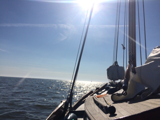 Om 6.30 gaat de wekker. Wiske even goed uitgelaten en toen rond 7.30 uitgevaren. Het is ijzig koud, maar zonnig! Om 9.30 zijn we door de sluis bij Workum. We zeilen voor de wind richting Kornwerd. Gelukkig kunnen we meteen geschut worden in de grote sluis. Wiske nog even laten plassen en snel doorgevaren. We willen het wantij nog halen maar met weinig wind gaan we niet zo snel. We lopen om 14.30 vast bij de keerton. Dat wordt wachten. Gelukkig vermaken we ons met wandelen in het ijskoude water. Het is inmiddels bloedheet!