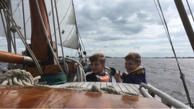 Na het ontbijt eendjes gevoerd. Bouwe roeit. Moet nog even oefenen. Teruggezeild met gereefd grootzeil. Het waait flink. Via Gouden Bodem terug. Snel opgeruimd en van boord.