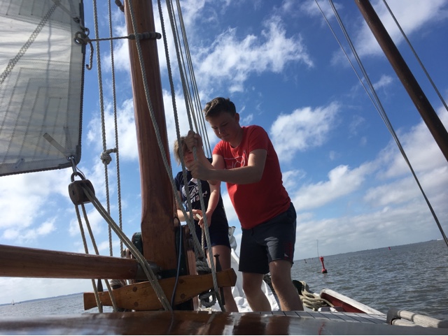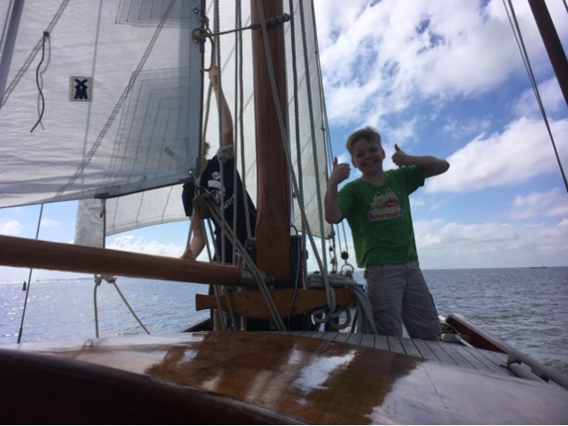 Om 7.00 opgestaan. Gedoucht. Met Bouwe naar het dorp om fietsen in te leveren, brood te halen en inkopen te doen. Heerlijk ontbeten in de zon. Om 10.30 maken we ons klaar om uit varen. Het wordt een prachtige tocht over het wad. Met halfwinder. Helaas moeten we de motor bijzetten om het laatste wantij te kunnen halen. Daar moeten we om half vijf uiterlijk overheen zijn. Het is vlak na springtij dus het gaat goed. Op de Eems gaan we recht over/onder de Meeuwenstaart. Captain’s choice is wet. Het gaat goed. Nog even ebstroom mee en wind tegen. Om 17.30 leggen we aan. Mooie voorspoedige tocht met mooi weer.