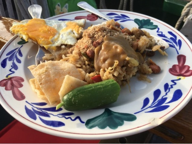 In de haven borrelen we en eten we in de kuip’blauwe hap’ (volgens Bouwe de lauwe hap). Een traditie die Zuiderzeevaartverpleegkundige en oud-marine heeft geïntroduceerd. En ach wie Jacque’s anekdote over nasivlees bestellen in Duitsland kent…. dubbeltoepasselijk.