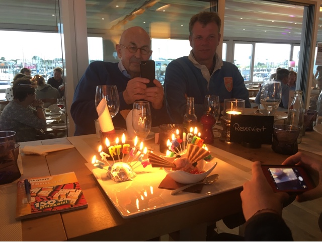 Vandaag is Minke 16 geworden. Ze is verbazingwekkend vroeg wakker. De boot gepavoiseerd en we ontbijten in de kuip. Ze krijgt een sup-paddel en een pennetje voor haar I pad. Na het ontbijt gaan we fietsen huren en naar het dorp. Daar shoppen we (mooie nieuwe jas voor Minke), eten een broodje garnalen en gaan op zoek naar een fles champagne voor opa. Die leveren vast af bij het hotel. Daarna snel naar de haven gefietst om Jan en Marleen bij de veerboot op te halen