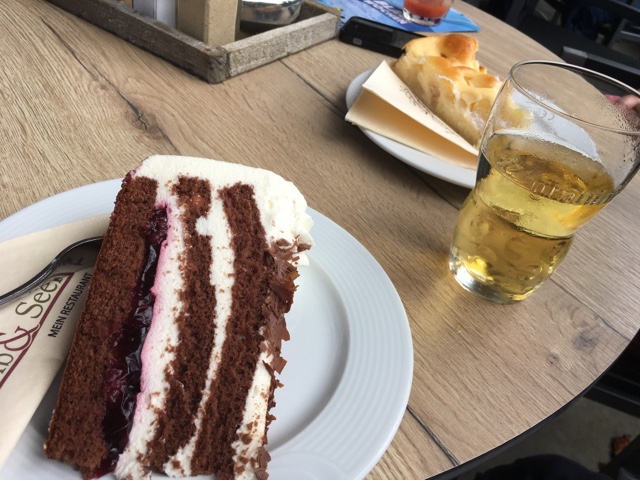 Het was een onrustig nachtje qua wind en regen maar s ochtends klaart het snel op. Bouwe speelt met Ties, Bastiaan leest en rommelt wat aan boord. Jurriaan, Minke en Jacque gaan koffiedrinken in het dorp op het terras bij Leib und Seele. Met taart!