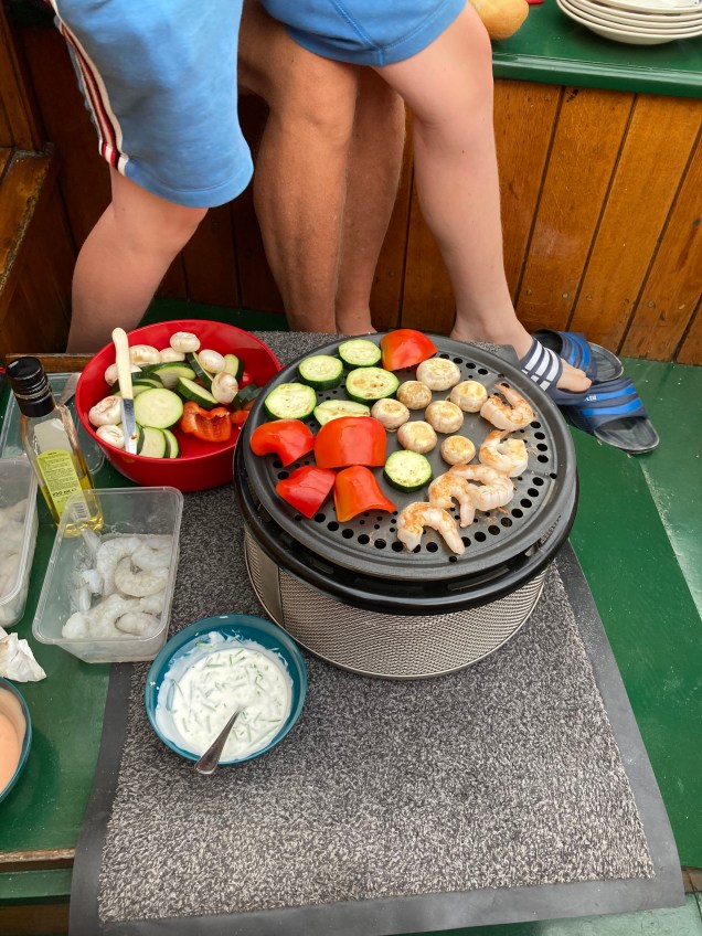 We eten gamba’s en groenten van de cobb. Deze keer gewoon op de motorkist. Dat werkt prima.