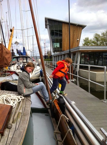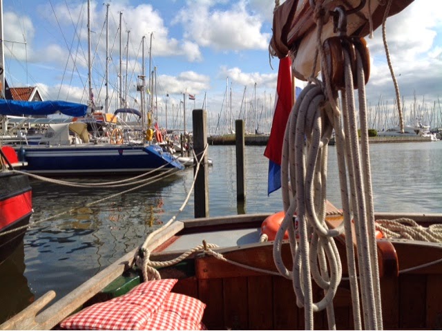 Tegen borreltijd zijn we in Stavoren. De manne pn kopen nieuwe blokken voor de fokkeschoot. Bouwe gaat de mast in om de vlaggenlijn los te maken.