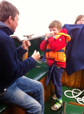 We besluiten tegen de wind in, kruisend, naar Stavoren te varen. Helaas breekt op de Fluessen het blok van fokkeschoot. Het is behoorlijk vlagerig en de Santa zeilt weer ouderwets als een patatbakkie niet aan de wind. Dus motor gestart. Er komen een paar flinke buien over. Degene met de beste pet mag aan het roer: