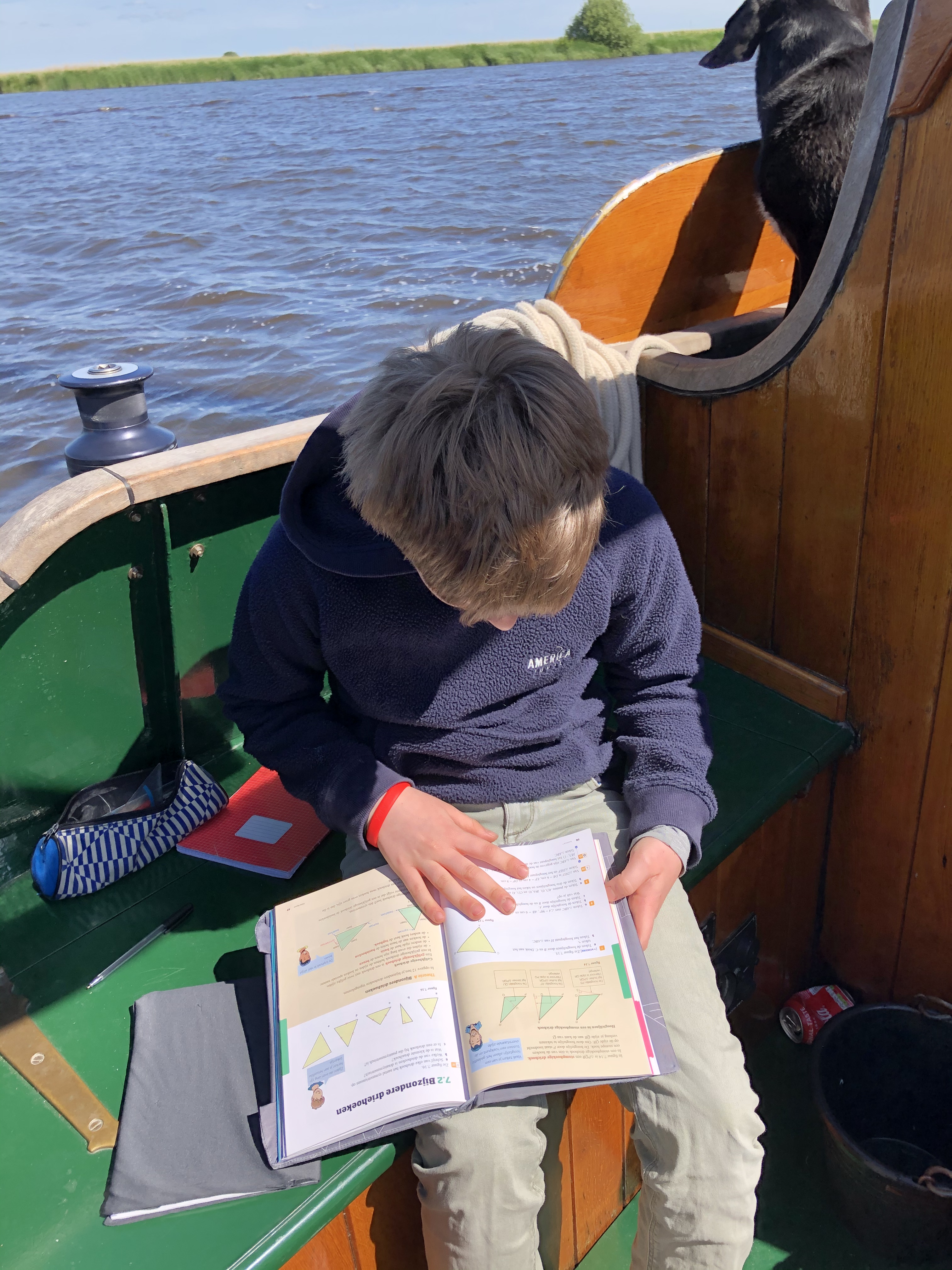 Bouwe maakt zijn wiskunde huiswerk aan boord.